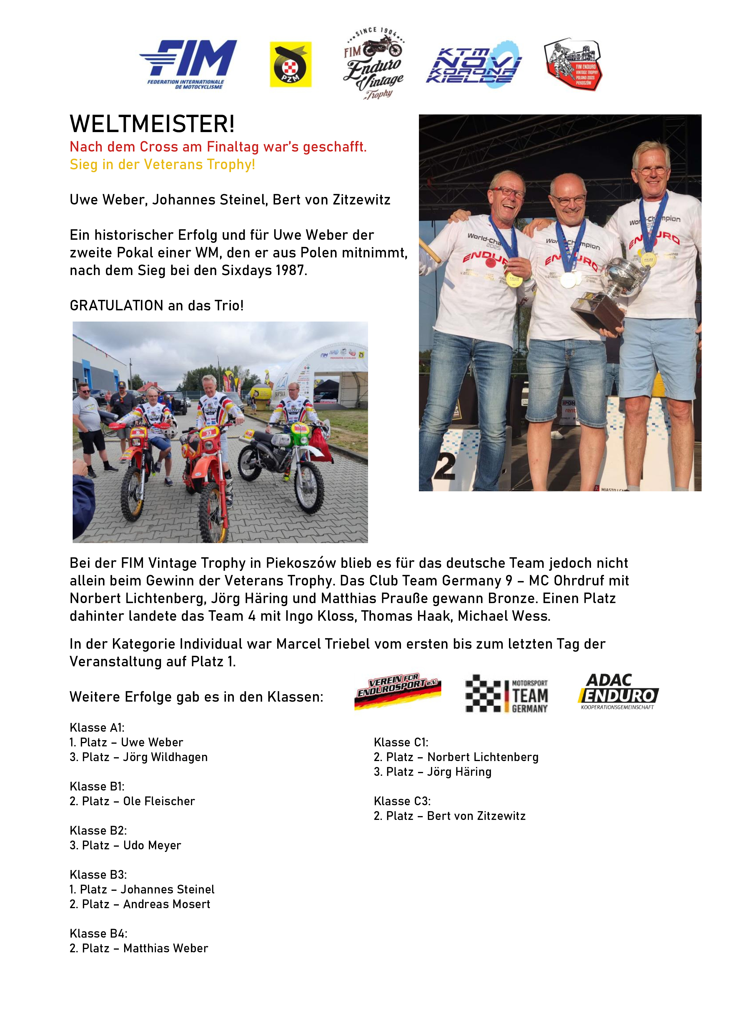 Die Vintage-Trophy finden vom 06.08 bis 09.08.2025 in Piekozow / Polen statt. Die Organisation der deutschen Teilnehmer erfolgt durch Heinrich Schmidt. Von insgesamt 60 Anmeldungen sind folgende Teams und Fahrer genannt, die Vertaranen-Trophy mit den Fahrern Bert von Zitzewitz, Uwe Weber, und Johannes Steinel, dazu 9 Silber-Vasen Mannschaften, 9 Club-Teams und einen Einzelfahrer. Aktuell liegen dem Veranstalter ca. 200 Nennungen vor, was die hälfte der Nennungen des Vorjahres bedeutet. Die deutschen Aktiven stellen bei der Vintage aktuell über einviertel der Teilnehmer. In Piekozow werden unsere Aktiven vom Logistikteam der Deutschen Enduro-Meisterschaft und dem LKW vor Ort unterstütz. Die Zusammensetztungen der verschieden Mannschaftenfinden sie unter der Rubrik Vintage.